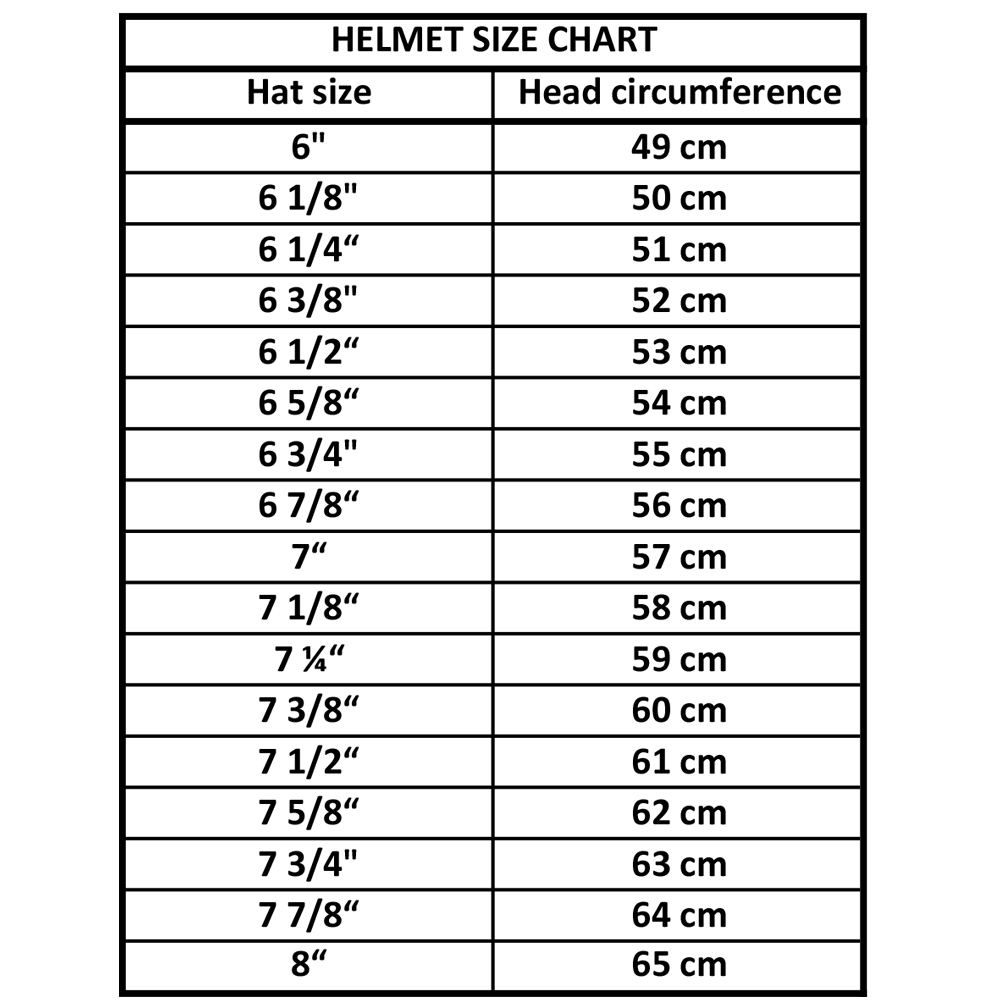 | Helmgröße: | 6 1/2", 6 3/4", 6 3/8", 6 5/8", 6 7/8", 7 1/8", 7" |